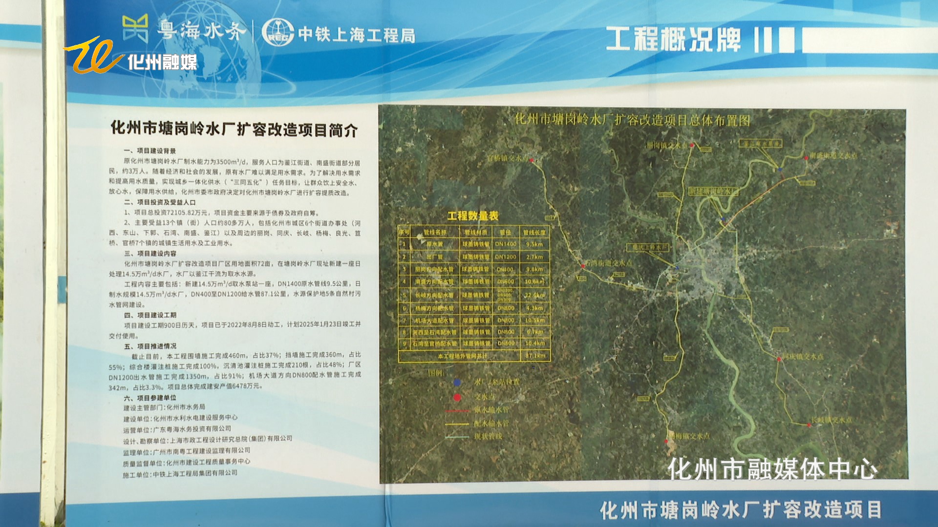 化州市塘岗岭水厂扩容改造项目是广东省2023年重大项目之一,项目位于化州市鉴江街道塘岗岭,管网建设涉及城区及 13个镇街,受益人口约80万人。项目自2022年8月8日开工建设,目前厂区的15个单体建设已完成8个,管网施工进度约为20%,各项工程正在稳步推进。 该项目主要建设内容包括新建塘岗岭水厂,水厂供水规模为14.5万m3/d,拆除现状塘岗岭水厂、新建输水管道 77.6km,管道铺设至城区街道外的丽岗镇、同庆镇、长歧镇、杨梅镇、良光镇、官桥镇、石湾街道、南盛街道等13个镇街交水点。工程项目概算总投资为7.21亿元。 近日,记者在该项目施工现场看到,工地上建筑排架耸立,多台大型吊机在忙碌作业,施工人员来往穿梭,一派热火朝天的景象。据介绍,为了确保工程进度,施工单位每天安排在厂区建设的施工工人达260多名,管网建设方面投入了4个施工队伍同时施工,力争年底基本完成工程建设。 中铁上海工程局集团有限公司项目负责人 胡宝成 【同期声】中铁上海工程局集团有限公司项目负责人 胡宝成:目前我们水厂这边总共有15个单体,已经完成了8个单体,正在施工4个单体,目前也有4个单体进入了装修阶段。管网方面累计完成施工16公里,占整体管网四分之一左右。下一步的施工计划是2023年8月31日厂区主体结构全部施工完成,力争今年年底设备安装完成;管网方面,力争在年底完成40公里的供水管网建设。 该项目建成后,将进一步缓解我市用水需求和提高用水质量,实现城乡一体化供水目标任务,为市民提供符合国际标准的优质水、放心水,惠及人口约80万人。 粤海水务化州副总指挥 刘奋兴 【同期声】粤海水务化州副总指挥 刘奋兴:粤海水务作为项目PC+O牵头单位,严格按照政府要求,千方百计,狠抓施工质量,确保进度,打造优质精品民生供水工程,提前完成供水目标。项目完成建设后,粤海水务将采用先进的运营管理模式,为化州市人民提供符合国际标准的优质水、放心水,践行粤海水务生命水、政治水、经济水的核心价值观。